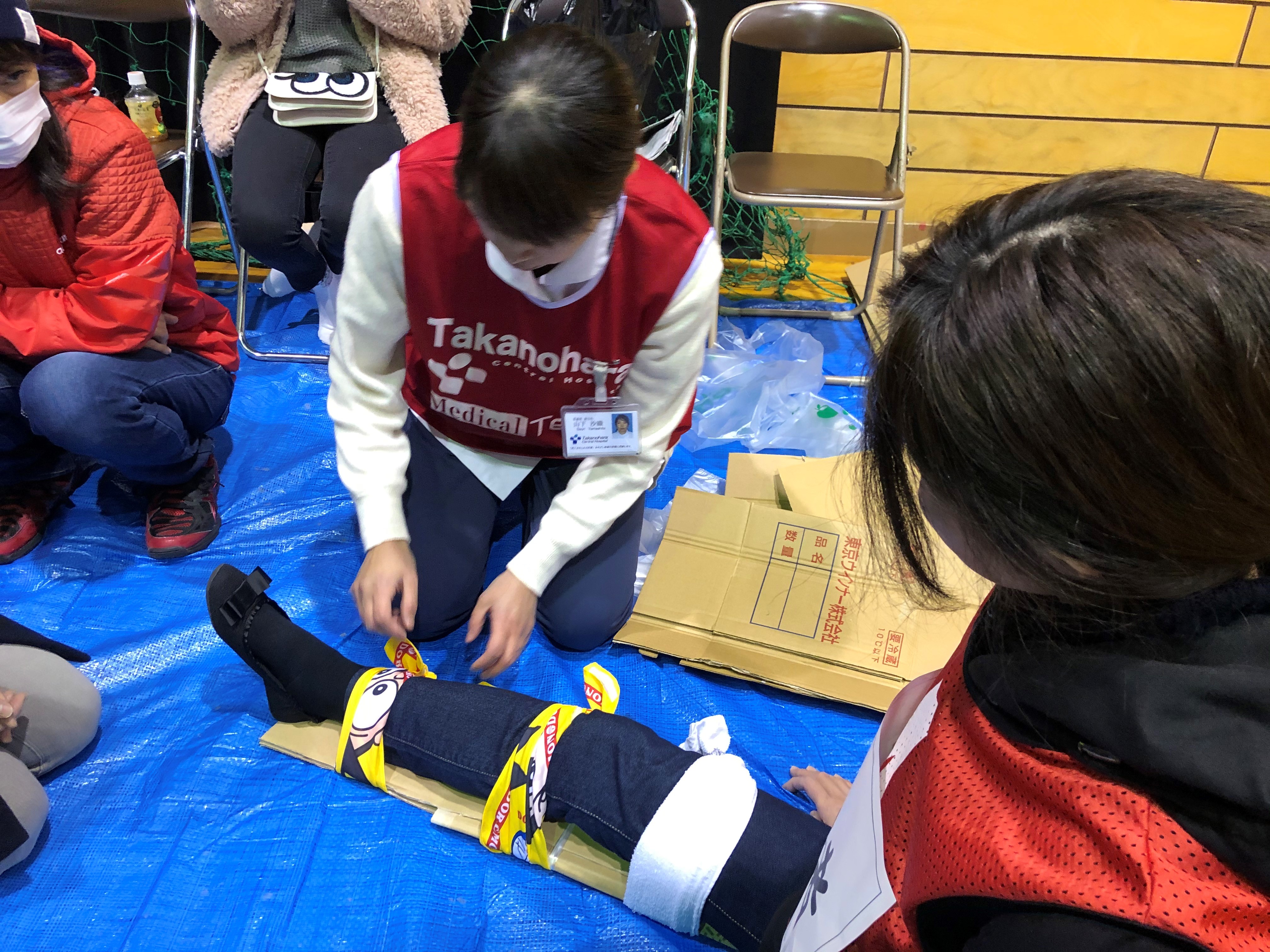そのなか、当院は応急手当て体験として災害時の止血・骨折の初期対応方法を体験していただくブースを出させていただきました。災害時は医療物品も手に入らないことや医療機関の受診が遅れたりすることが予想されます。